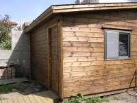 המחסן בנוי מעץ אורן מחוטא, גג שינגלס, דלת כניסה, ריצפת עץ תואמת וחלון רפרפה אחורי כולל רשת.